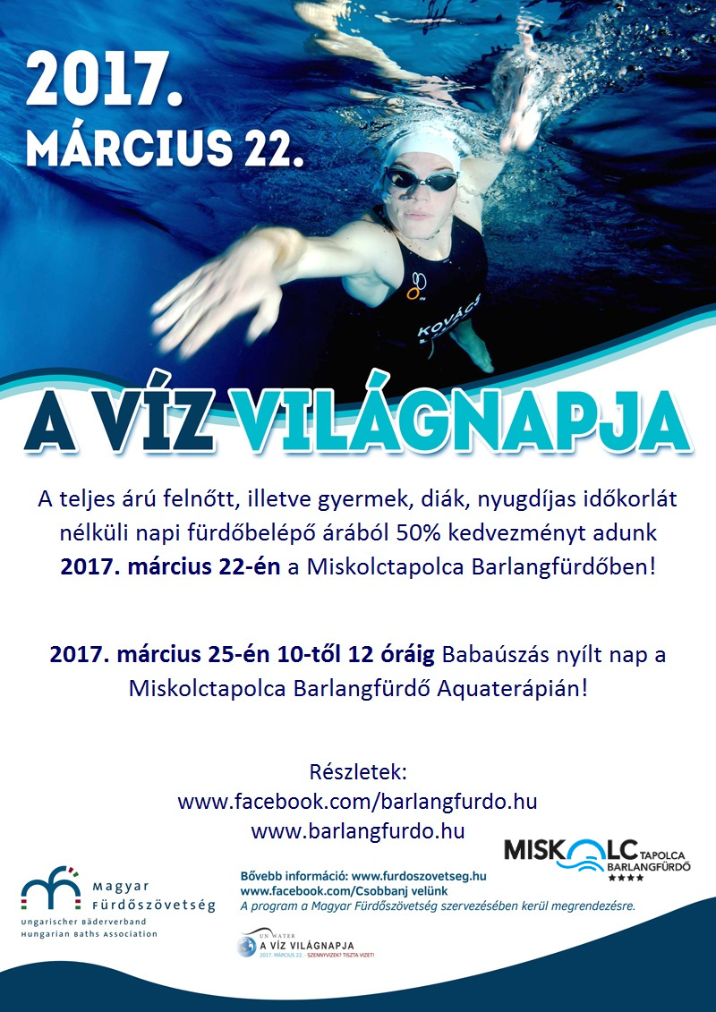 Ennek keretében 2017. március 22-én a teljes árú felnőtt, illetve gyermek, diák, nyugdíjas időkorlát nélküli napi fürdőbelépő árából 50% kedvezményt adunk a Miskolctapolca Barlangfürdőben!