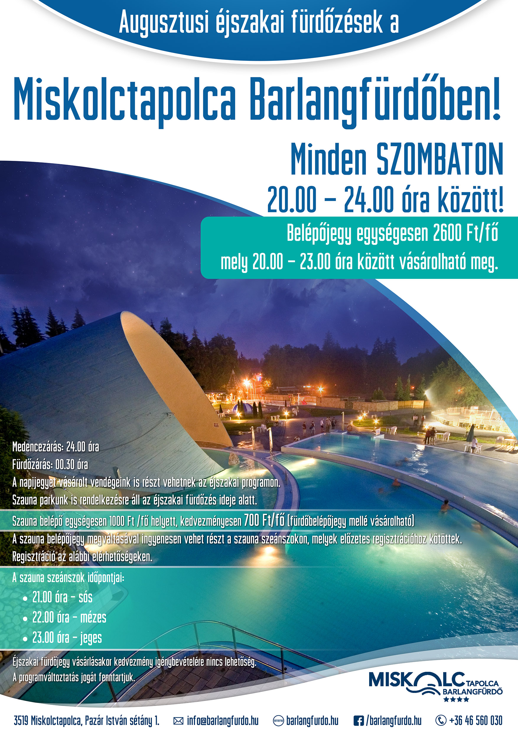 A szauna belépőjegy megváltásával ingyenesen vehet részt a szauna szeánszokon, melyek előzetes regisztrációhoz kötöttek. Regisztráció az info@barlangfurdo.hu e-mail címen vagy +36 46 560-030 telefonszámon.