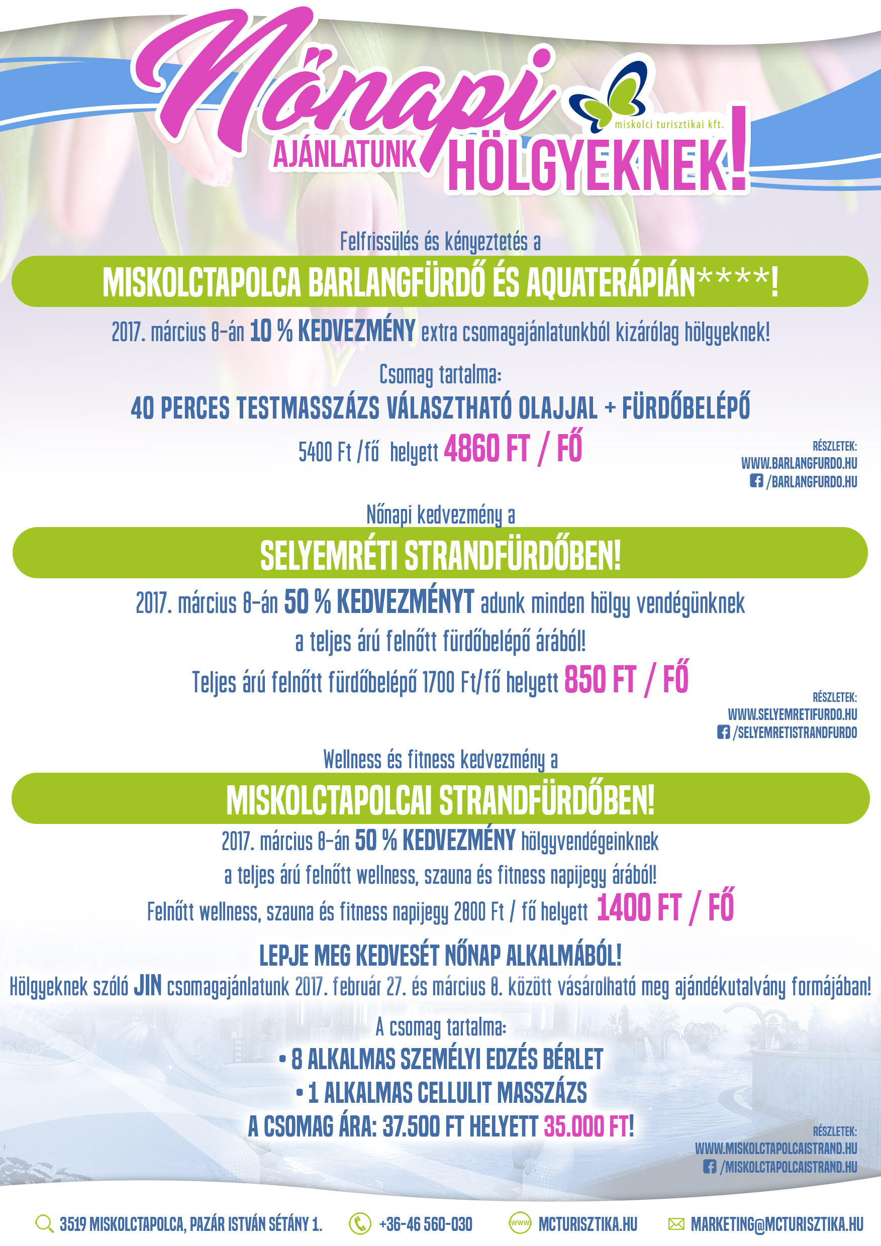 2017. március 8-án 50 % kedvezményt adunk minden hölgy vendégünknek a teljes árú felnőtt fürdőbelépő árából!